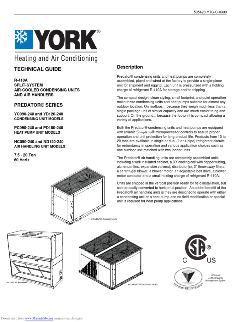 Technical manual york yd180 technical manual 38 pages r 410a split system air cooled condensing units and air handlers predator series.